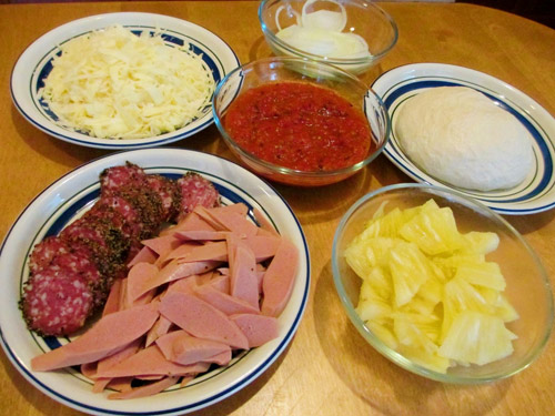 Bạn cần thái xúc xích thành lát mỏng, dứa và hành tây cũng được thái miếng vừa ăn. Sau đó, bạn nên lấy đế bánh ra và phết một lớp tương cà lên trên, tiếp theo hãy rải phô mai bào sợi lên trên bề mặt, các miếng xúc xích sẽ được trải đều khắp bánh. Xen kẽ vào đó là dứa, hành tây, ớt xanh, ớt đỏ đã thái miếng vừa ăn tạo cảm giác ấm cúng.