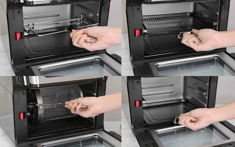 Bước 2: Các bạn hãy lấy toàn bộ các phụ kiện như giỏ chiên, khay nướng, vỉ nướng, khay xiên quay tay và các loại tay cầm, kẹp...để vệ sinh bằng nước nóng hoặc vệ sinh bằng chất tẩy rửa nhẹ.