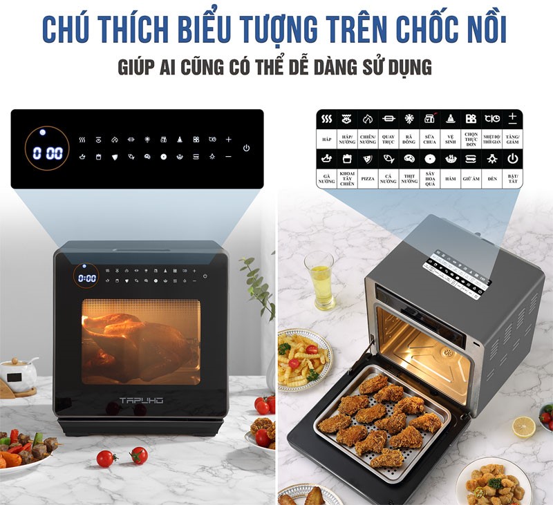 Nồi chiên hơi nước Tapuho khác hoàn toàn so với nồi chiên không dầu. Sản phẩm có 4 chế độ nấu bao gồm: chiên – nướng – hầm – hấp. Người sử dụng sẽ được cung cấp 60 chương trình nấu thức ăn chuyên nghiệp.