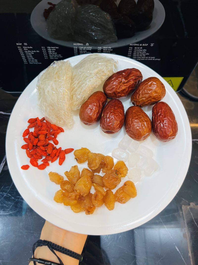 Bước 1: Sau khi đã sơ chế yến sạch sẽ, các bạn hãy cho yến vào thố hoặc từng hộp thủy tinh nhỏ theo định lượng mong muốn. Các bạn có thể mix thêm một số nguyên liệu khác như: táo đỏ, kỷ tử, long nhãn, đường phèn, hạt sen, đông trùng hạ thảo, hạt chia và gừng để cho yến thơm ngon hơn.