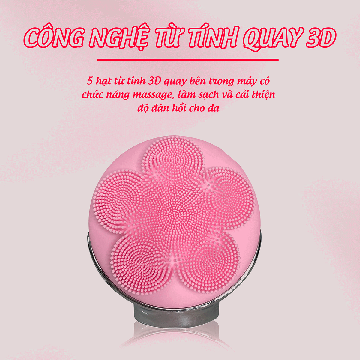 Dưới lớp silicone có 3 hạt từ tính 3D chuyển động quay nhẹ nhàng trong máy có chức năng massage, làm sạch, cải thiện độ đàn hồi cho da và ngăn ngừa tình trạng lão hóa da, tránh trường hợp bị chảy xệ da mặt.