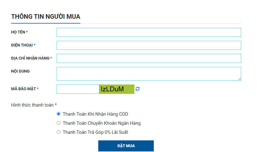 Bước 4: Điền thông tin đơn hàng chính xác. Thông tin bao gồm: Họ tên, số điện thoại, địa chỉ giao hàng và mã bảo mật đơn hàng do website cung cấp. Sau đó nhấp vào nút Đặt hàng để hoàn tất.