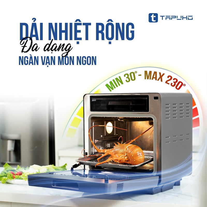 Nồi chiên không dầu hơi nước Tapuho có dải nhiệt rộng từ 30 độ đến 230 độ. Với dải nhiệt này, các bà nội trợ có thể thoải mái sáng tạo hàng vạn món ăn ngon khác nhau. Bạn có thể sử dụng nồi chiên hơi nước Tapuho để ủ men bánh, làm sữa chua, sấy hoa quả, nướng bánh cho đến chiên khoai, nướng thịt…Mỗi một món ăn sẽ có một nhiệt độ riêng và việc của bạn là cài đặt nhiệt độ sao cho đúng và chờ đợi thành phẩm.